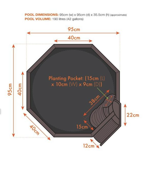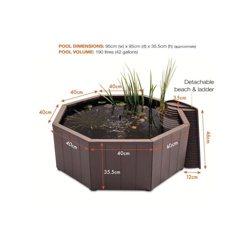 Estas medidas permiten integrar el estanque en diferentes espacios exteriores manteniendo un tamaño compacto.