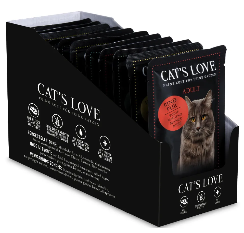El formato de Cat's Love adulto multipack (2×6 variedades 85gr) está diseñado para facilitar la organización de la alimentación del gato. Al incluir 12 unidades individuales permite planificar las comidas durante varios días de forma sencilla.
