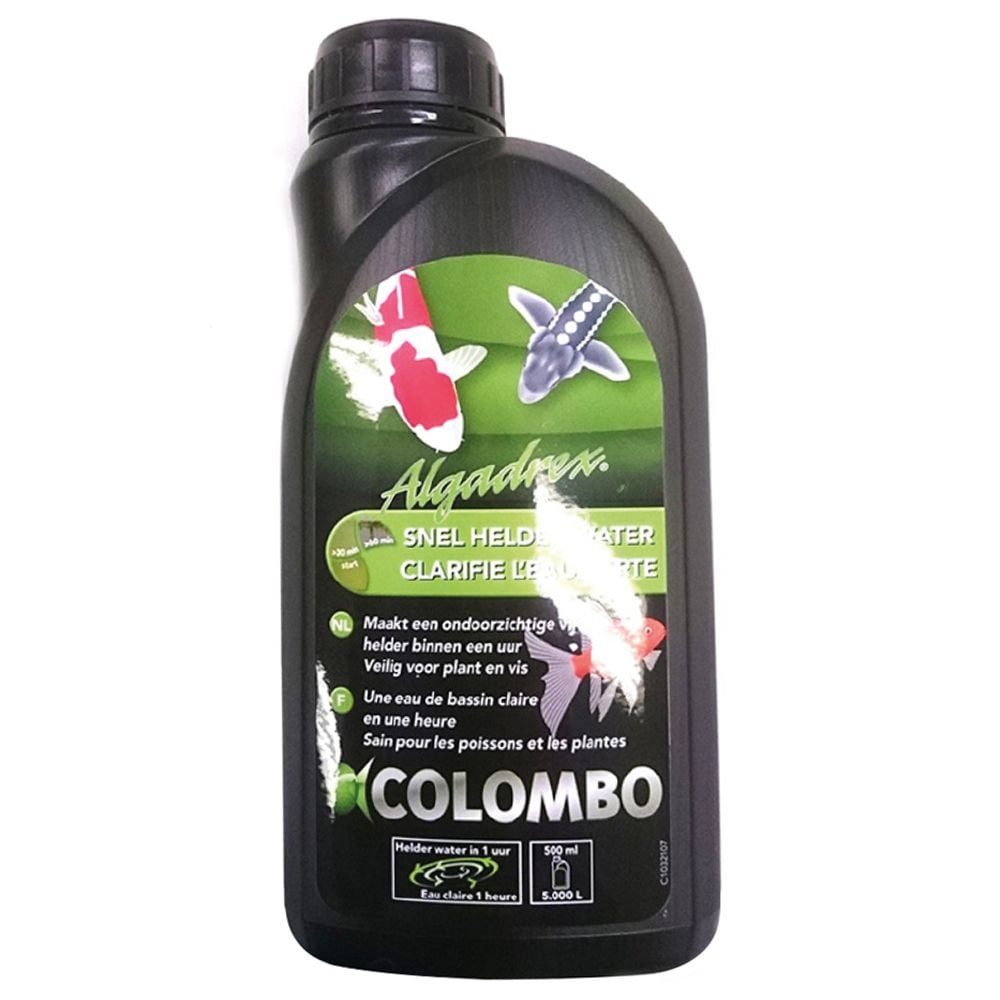 El colombo algadrex 500 ml es un potente clarificador de agua diseñado para eliminar rápidamente las algas flotantes (agua verde) en acuarios y estanques de jardín.
