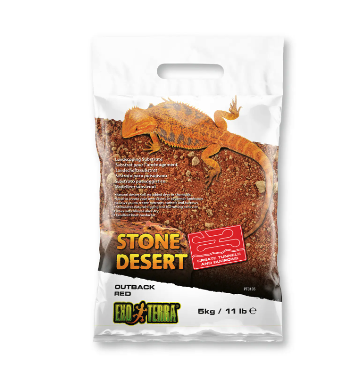 EXO TERRA Outback Red Stone Desert 5kg es un sustrato diseñado para la creación de entornos desérticos dentro de terrarios para reptiles. Los hábitats áridos presentan características muy particulares tanto en textura como en color del suelo. Este tipo de sustrato permite reproducir visualmente ese tipo de paisajes facilitando la decoración del terrario con un aspecto natural inspirado en regiones desérticas.