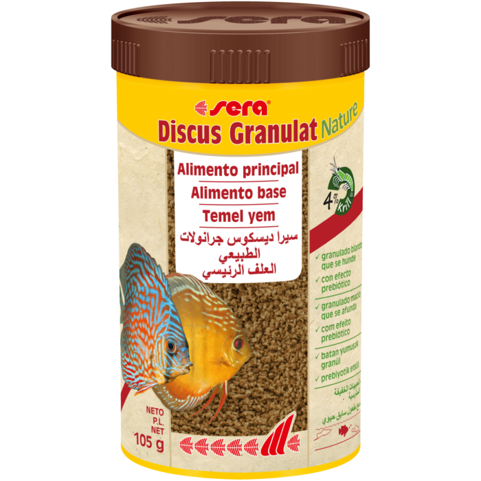 sera Discus Granulat Nature es el alimento principal en forma de granulado blando elaborado manteniendo todas sus propiedades sin colorantes ni conservantes para todos los discus (también alevines) y otros peces ornamentales exigentes.